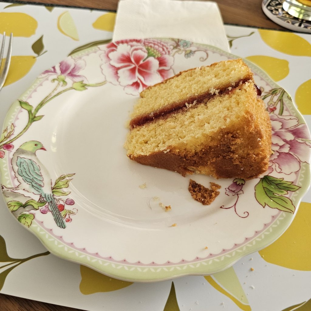 …and then a bite to eat! Salad and meats courtesy of Roy, followed by homemade Victoria Sponge. Cheers, both, we needed that!