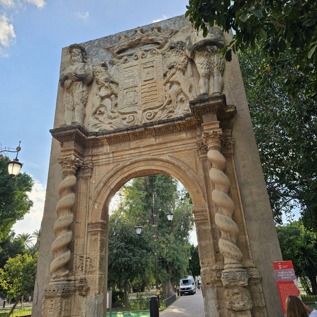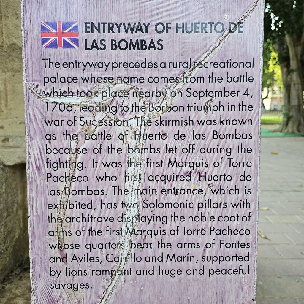 4.20pm: Nestled near the banks of the Segura River, this was another of today’s delightful walks. Highly manicured flower beds, together with a perfectly paved area for walking, eventually gave way to the rather imposing Heurto De Las Bombas – this historic entrance/doorway was the scene of a military confrontation in 1706.