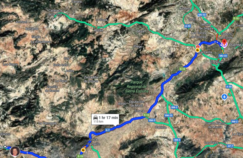 12.05pm: We headed for the city of Murcia (population, almost half a million!). At just over 100kms, the journey took about an hour. The road was a delight, hassle – and pothole – free!