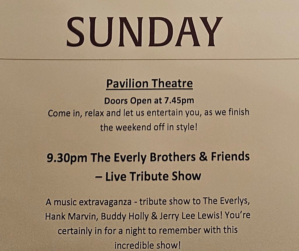 9.05pm: We headed off to the now-familiar Pavilion for tonight’s headline act – The Everly Brothers & Friends.