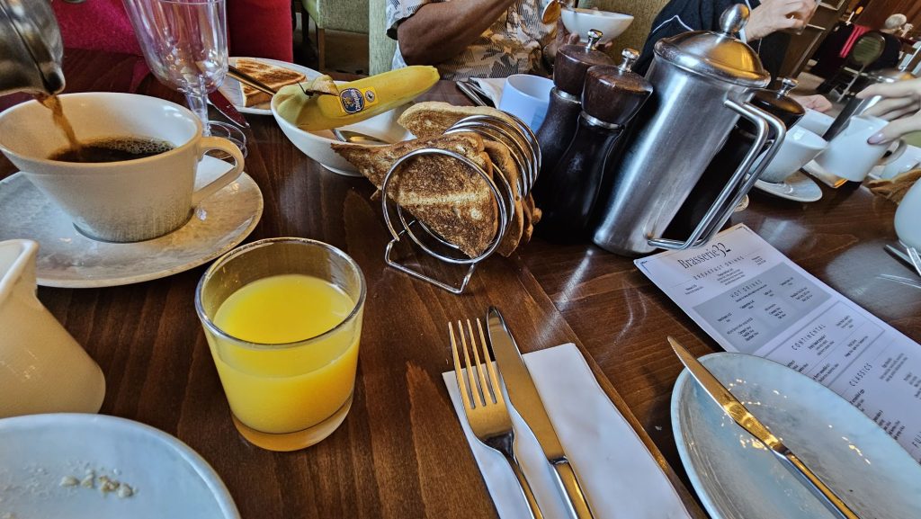 10.03am: For Breakfast, we were all back at the Market Kitchen – and the free-for-all that is ‘self service’! Or were we? Actually, no! The system seemed to be slightly confused as to exactly where the eight of us should be. The staff did their best to be helpful, but ‘computer said no’ thinking the 8 of us had somehow been reduced to 6, and where the table had been set accordingly! Doh! 😠. Eventually they ended up re-locating us to the (slightly more sedate) Brasserie32.