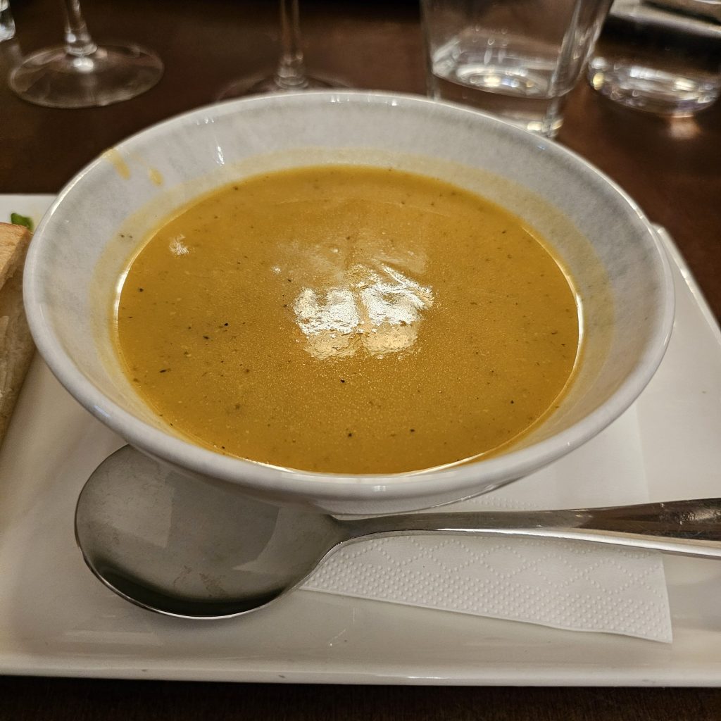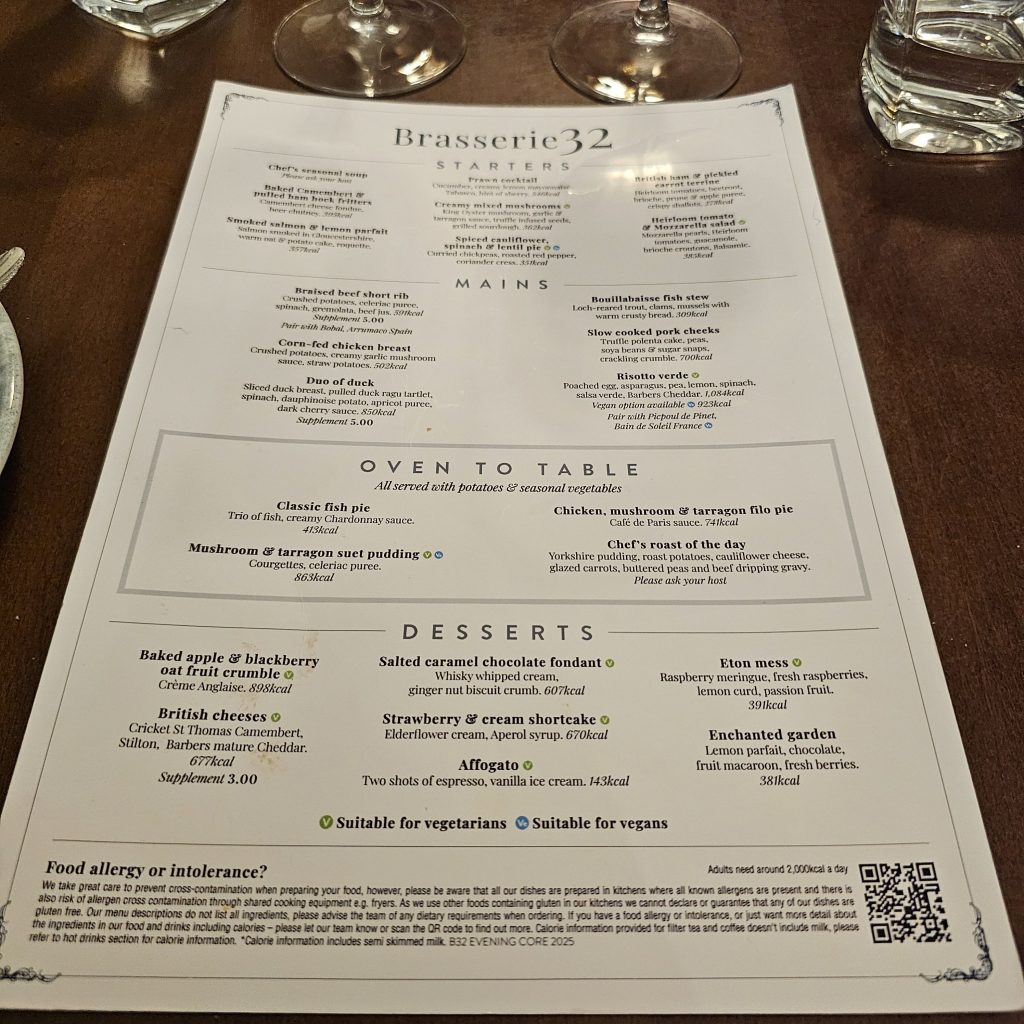 7.45pm: Yes, more to eat! 😋😋. Our (final) evening meal beckoned from a return to Brasserie32. This time, it all came together in that they knew we were coming AND they set the table for the right number of people!