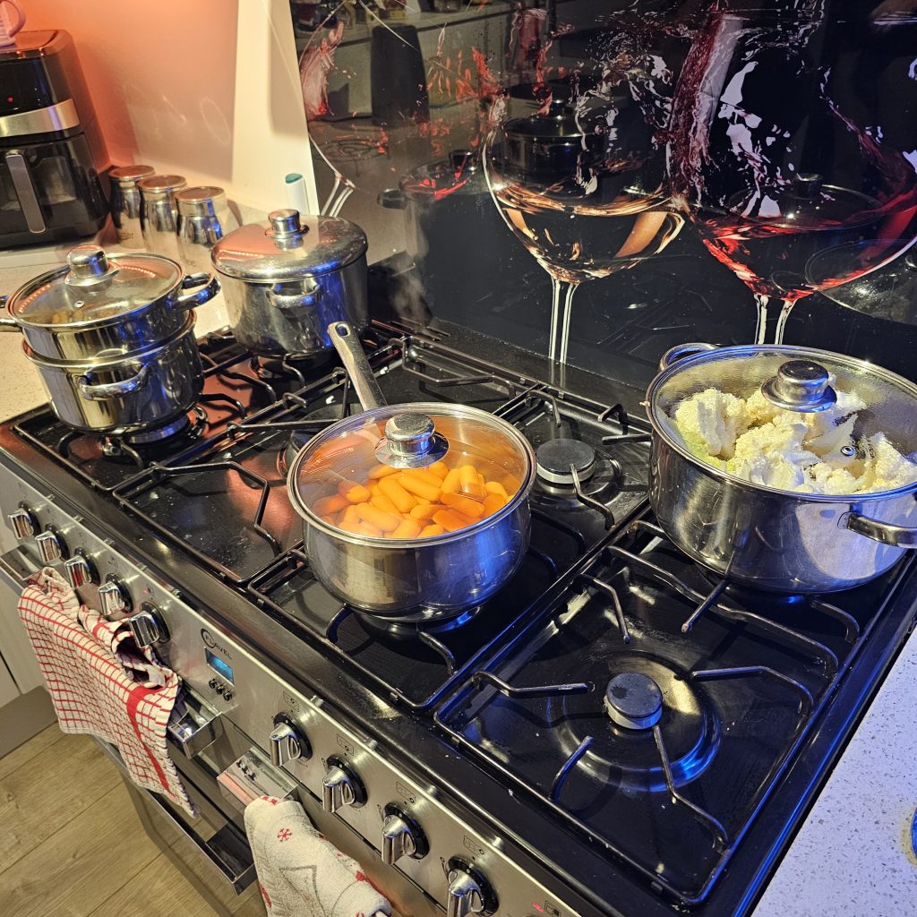 Meanwhile, the cooker was on overtime getting the food ready (with more than a little help from Trish!). This year: a full-on Christmas Roast Turkey meal!