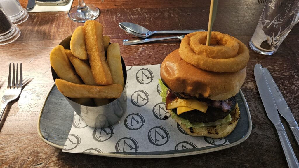 Ann: Fish & Chips; Rhon: Steak Burger, Geoff: Bangers & Mash, and I chose their Wagyu Burger. All good decisions where we all enjoyed our respective choices.