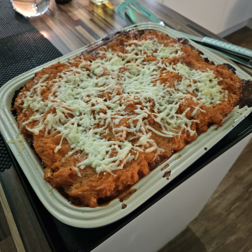 Ann, as usual, did miracles in the kitchen! 😀. Tonight, she served up ‘Mexican Cottage Pie’ – a slightly spicier variation on that Brit favourite with Sweet Potato Mash taking place of the usual topping!