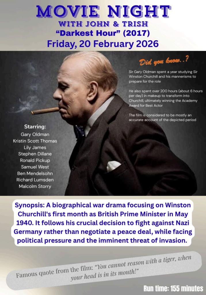 What an engaging Film! Even though we’ve seen it a few times, it was just as watchable tonight as it was during our first screening all those years ago. Top marks for Sir Gary Oldman, who did such a convincing job of portraying the iconic Brit! They don’t make Brits like that anymore! Sir Winston Churchill may not have had a perfect record, but he got us through one of the most challenging periods of our history