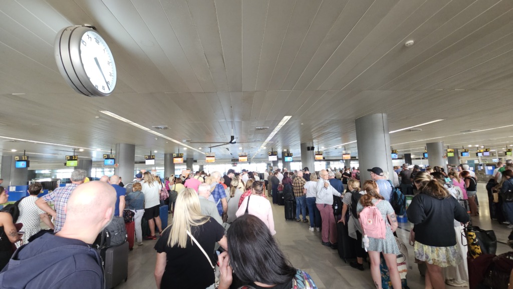 4.22pm: In fact, for once, things got BETTER. After a fairly swift piece of ‘extreme queuing’, our bags were all checked in, and then we noticed they had called the flight early.